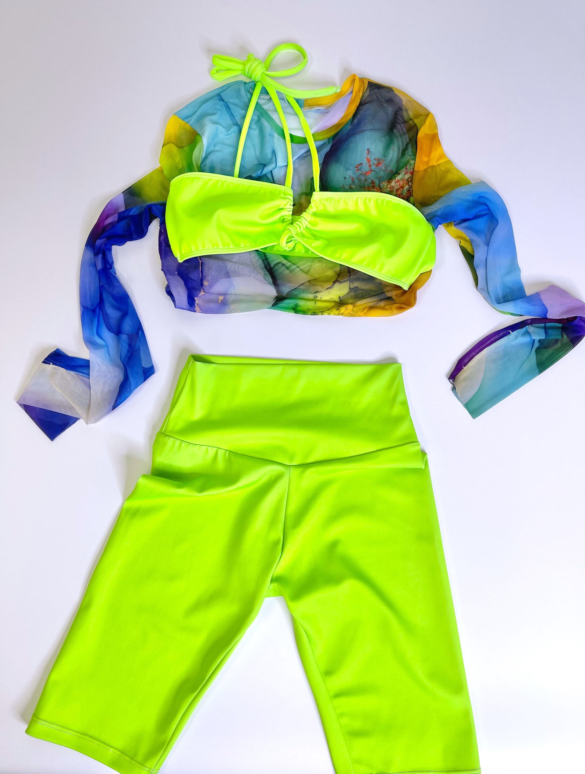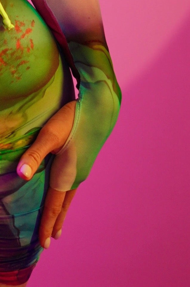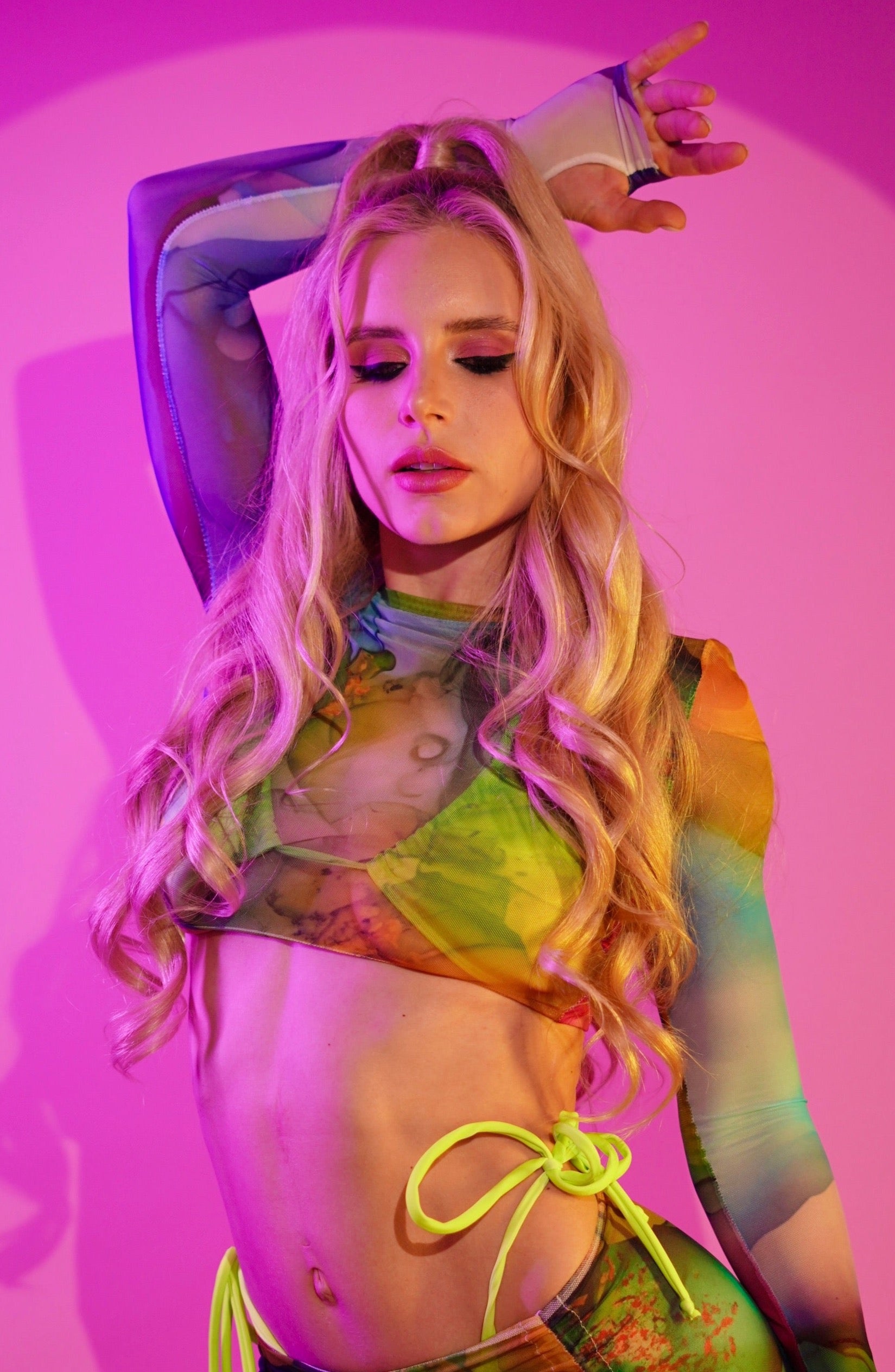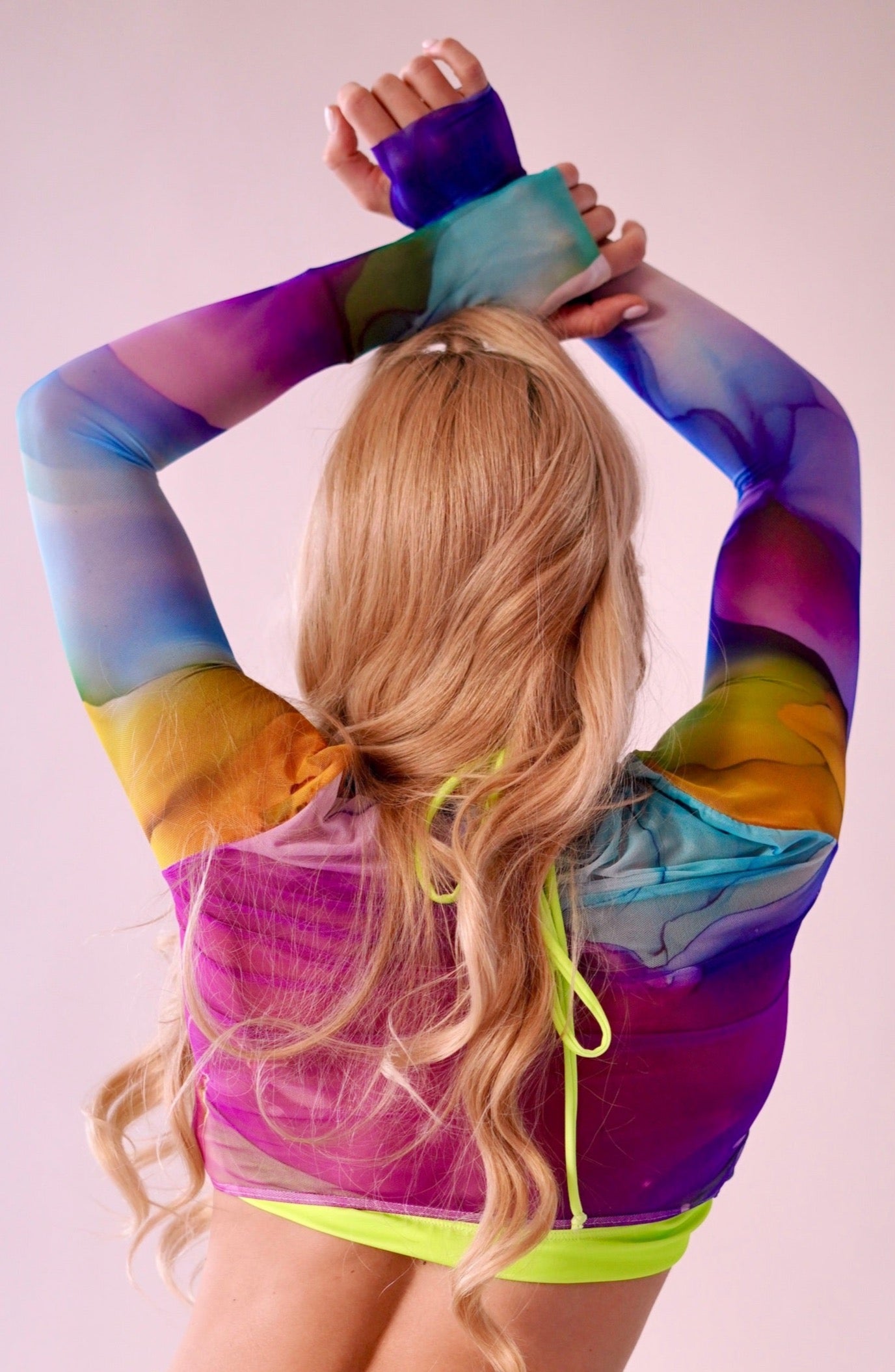Fuchsia Liquid Fantasy - Mesh Long Sleeve Crop Top